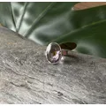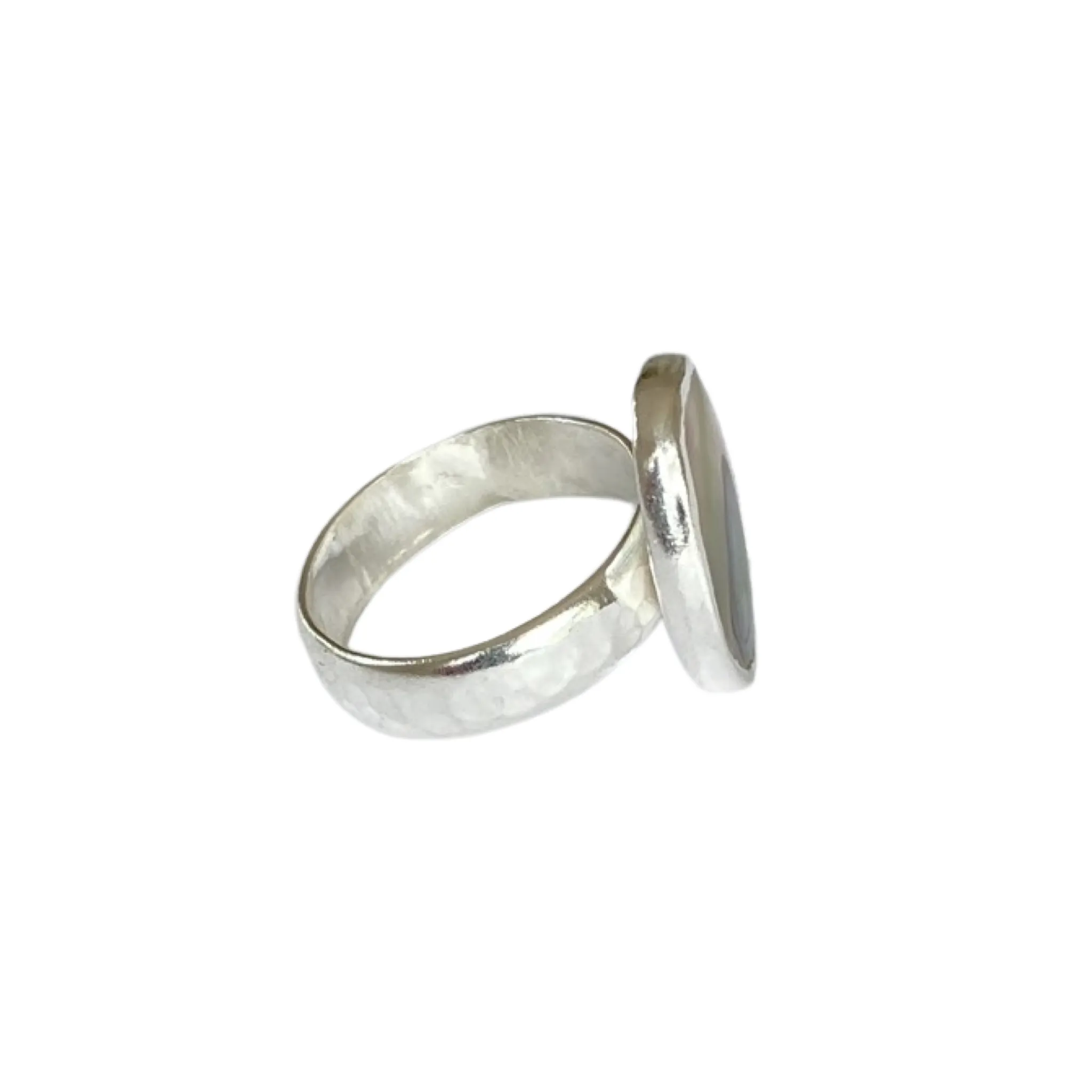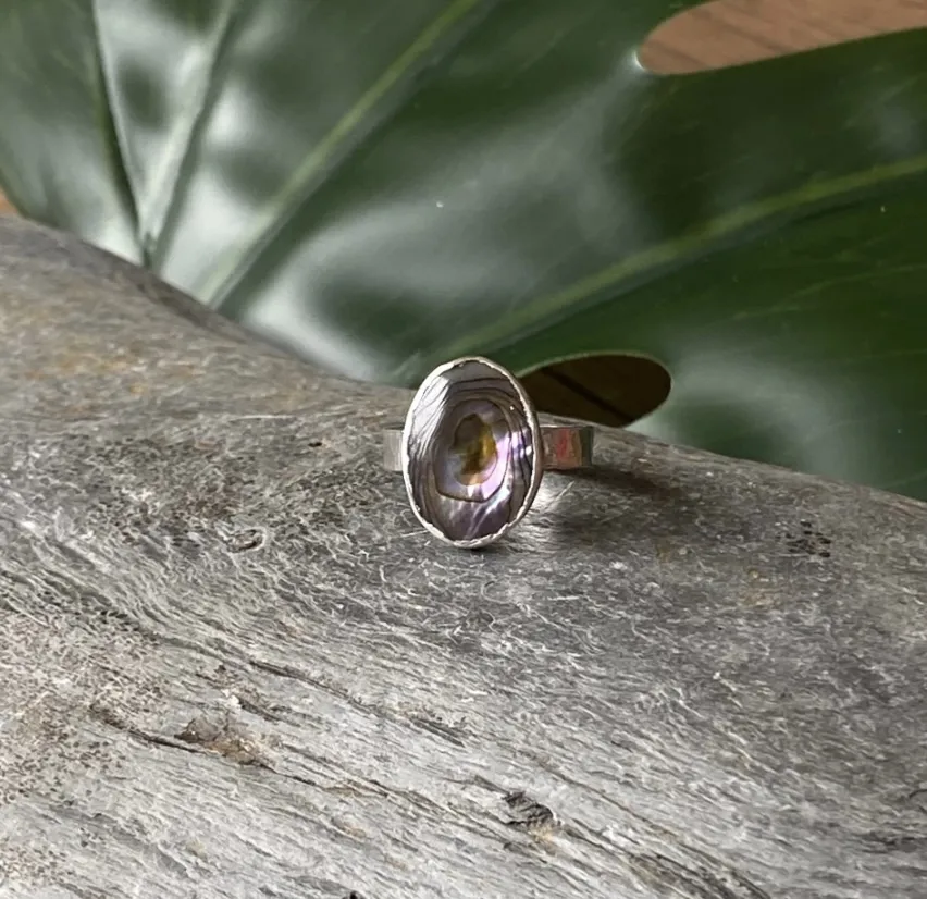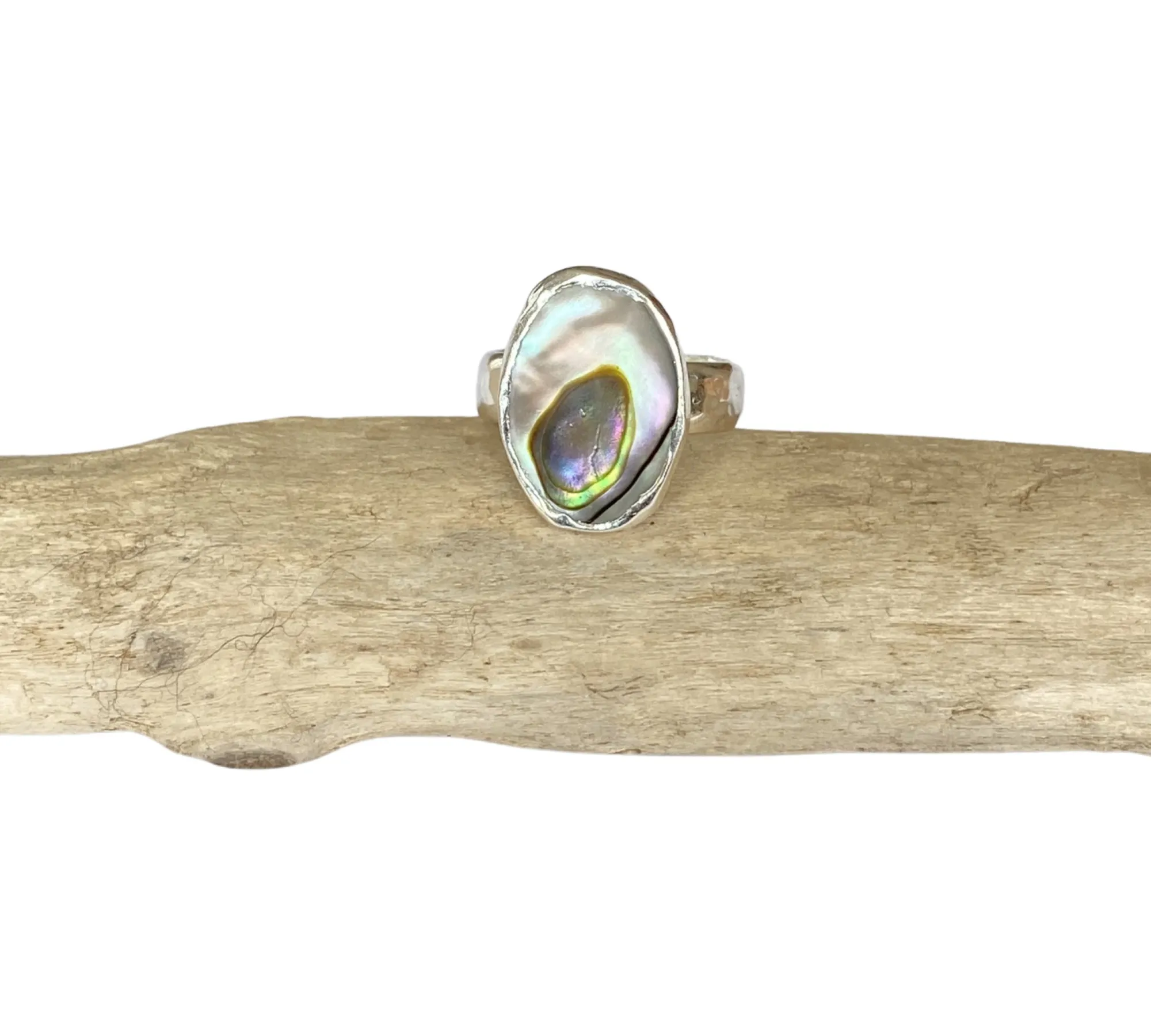 The Abalone shell is 18mm in length and 10mm wide. The sterling silver ring band is 4mm wide and has been hammered to give texture to the ring. If you prefer a thinner band just message me. Or if you prefer a smooth finish.