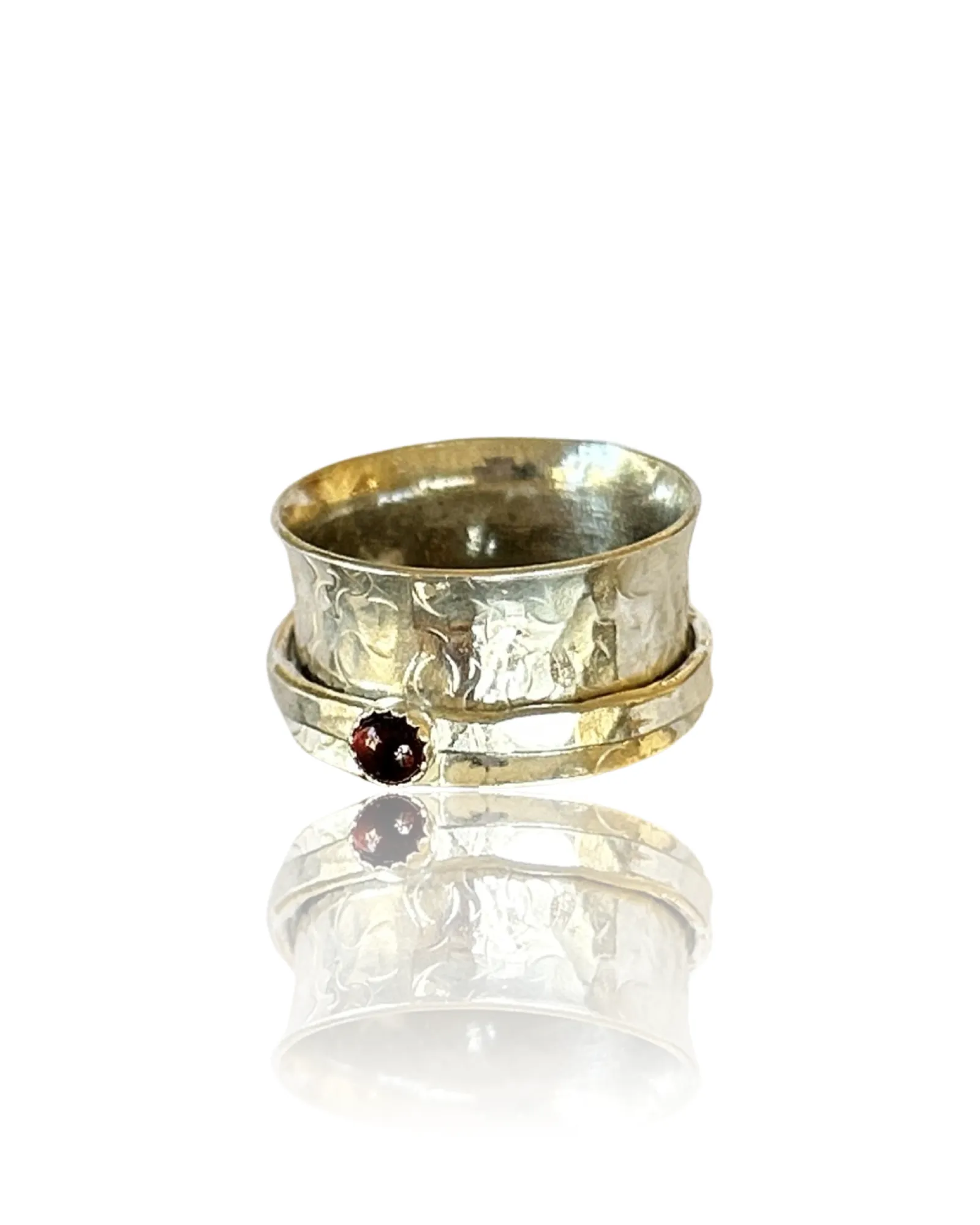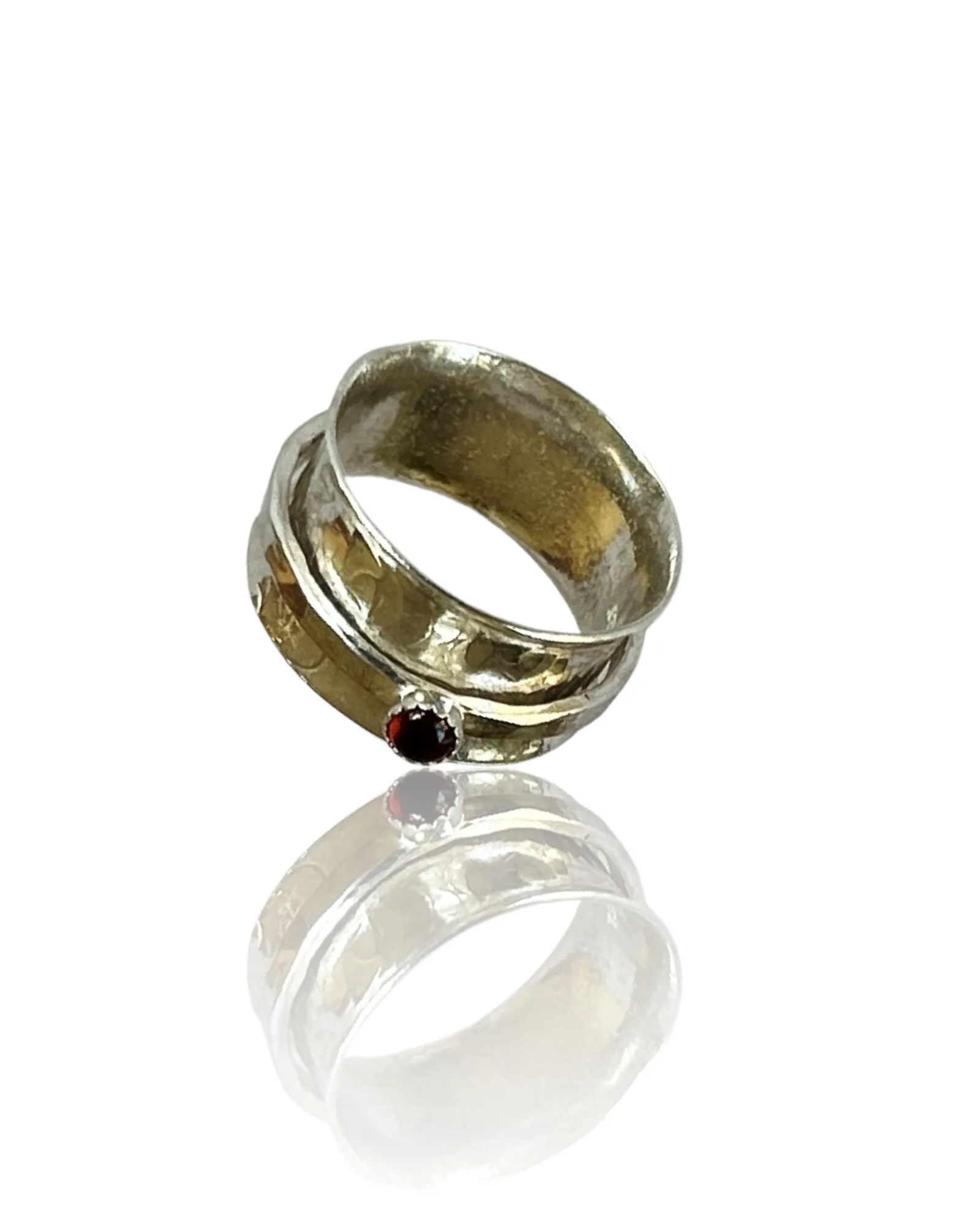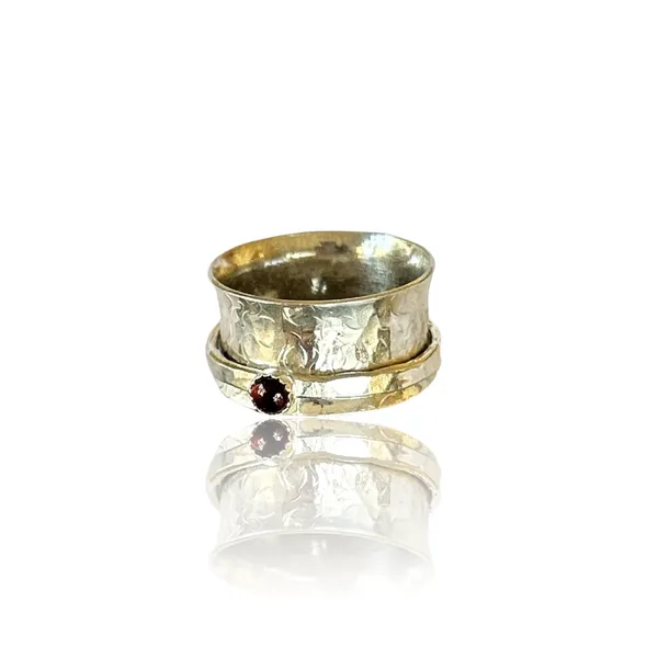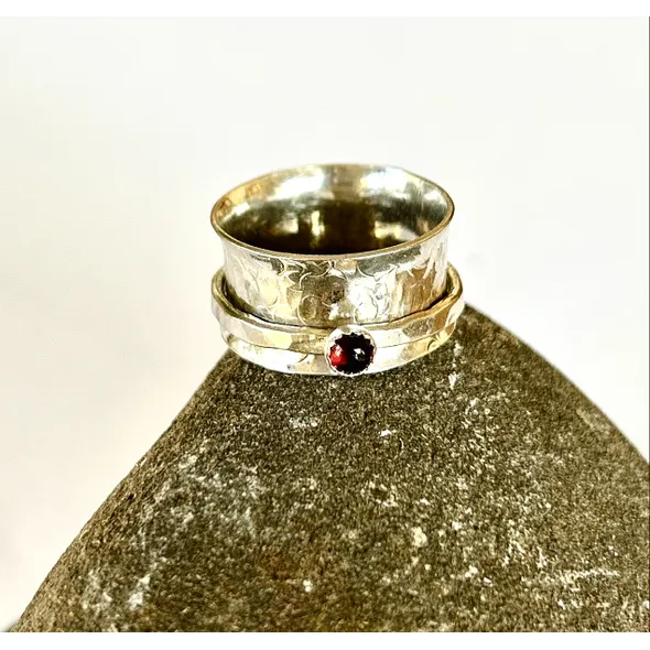 Handmade artisan sterling silver garnet spinner ring. A beautiful piece of jewelry that features a garnet gemstone as its centerpiece. Garnet is a gemstone that is traditionally associated with the month of January, and it is believed to symbolize love, friendship, and trust. Spinner rings are unique pieces of jewelry that feature one or more spinning bands that rotate around a stationary band. This design creates a mesmerizing effect that is both beautiful and calming. A sterling silver garnet spinner ring is an excellent choice for someone who wants a unique and meaningful piece of jewelry that is both elegant and versatile. The sterling silver metal is durable, easy to care for, and has a timeless beauty that will never go out of style. The garnet gemstone is 3mm in size adds a touch of color and personality to the ring, making it a perfect gift for someone born in January or anyone who appreciates the beauty of this stunning gemstone. The band is 10mm wide Overall, a handmade artisan sterling silver garnet spinner ring is an excellent choice for anyone looking for a special piece of jewelry that is both beautiful and meaningful.