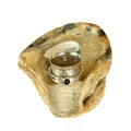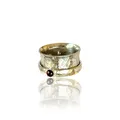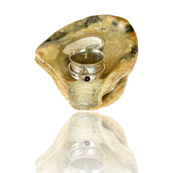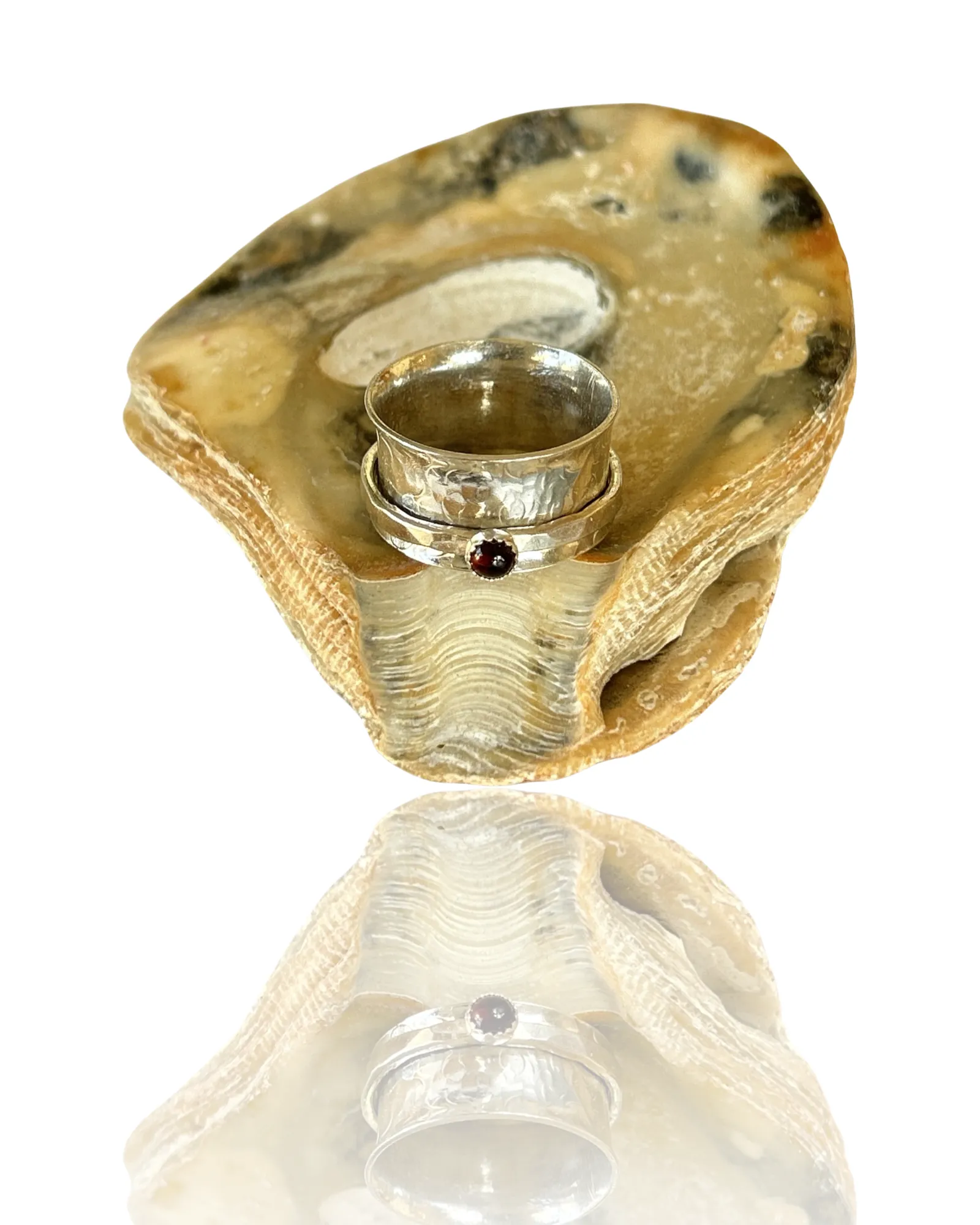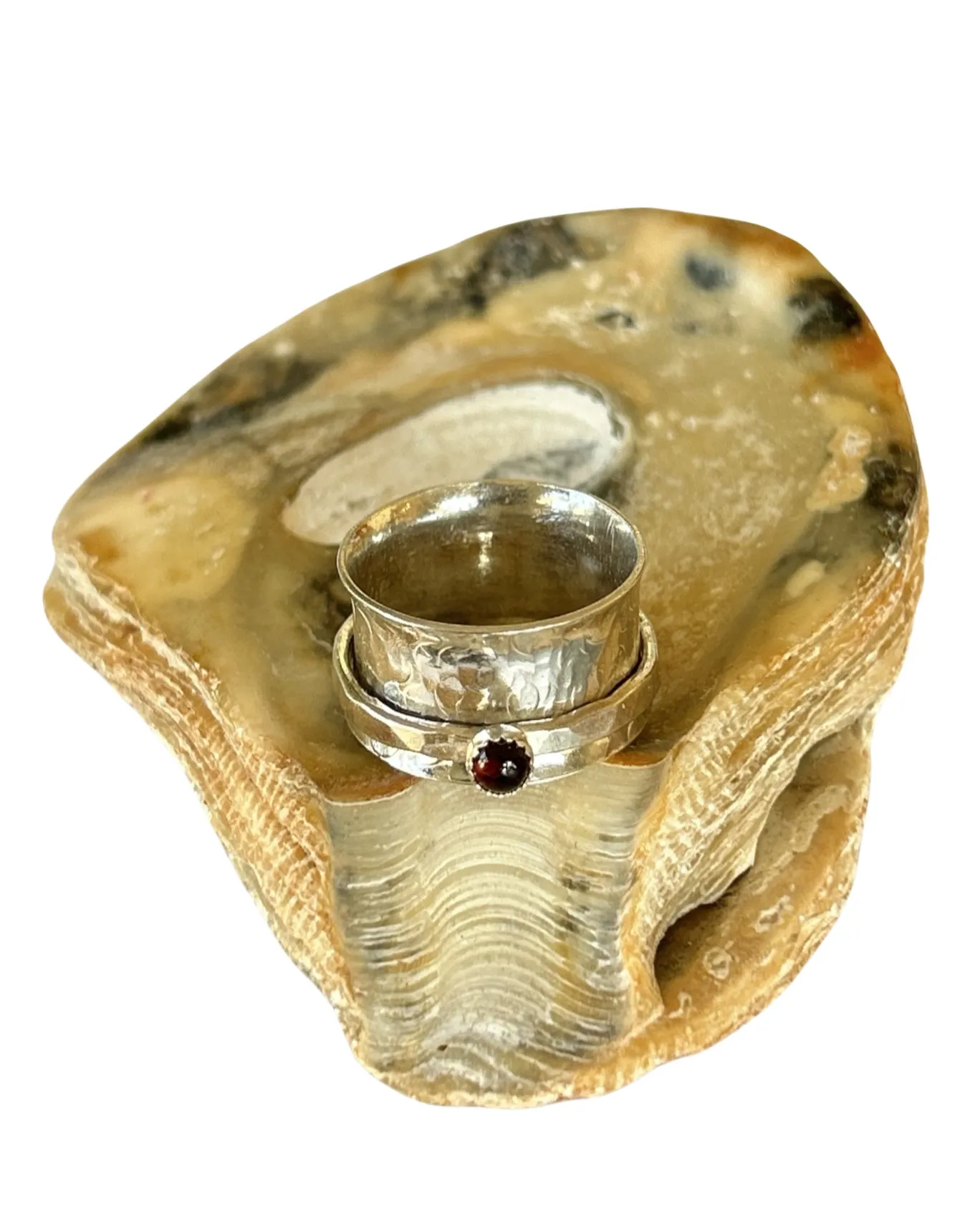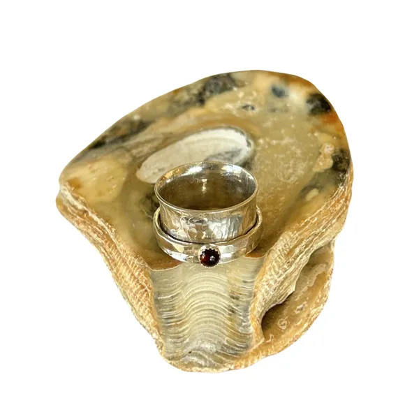 Handmade artisan sterling silver garnet spinner ring. A beautiful piece of jewelry that features a garnet gemstone as its centerpiece. Garnet is a gemstone that is traditionally associated with the month of January, and it is believed to symbolize love, friendship, and trust. Spinner rings are unique pieces of jewelry that feature one or more spinning bands that rotate around a stationary band. This design creates a mesmerizing effect that is both beautiful and calming. A sterling silver garnet spinner ring is an excellent choice for someone who wants a unique and meaningful piece of jewelry that is both elegant and versatile. The sterling silver metal is durable, easy to care for, and has a timeless beauty that will never go out of style. The garnet gemstone is 3mm in size adds a touch of color and personality to the ring, making it a perfect gift for someone born in January or anyone who appreciates the beauty of this stunning gemstone. The band is 10mm wide Overall, a handmade artisan sterling silver garnet spinner ring is an excellent choice for anyone looking for a special piece of jewelry that is both beautiful and meaningful.