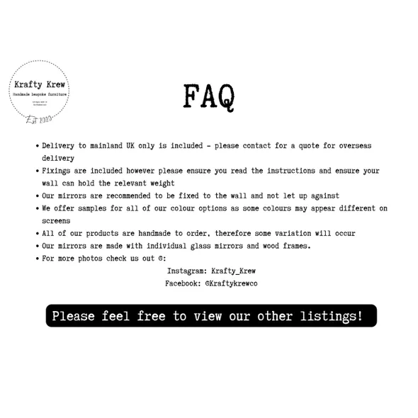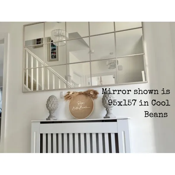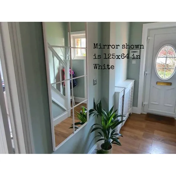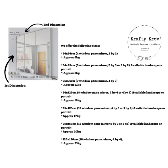 Handmade Industrial Style Wood Window Mirror | Industrial Mirror | Panel Mirror | Crittal Mirror | Bespoke Mirror - Lots of choices of colour, you pick!___________________________________________________________________We really take the time to ensure that quality takes priority on our beautiful bespoke wooden window mirrors. No corners are cut when we handmake these stunning mirrors, they truly stand the test of time and make a feature of any room in your home!We can craft this mirror in a variety of colours, it is your choice! Please view our photo to see standard colour options however if you’re after something else then please get in touch!**Delivery Lead Time**Please note our current lead time, each mirror is made to order and whilst we do our very best to dispatch orders as soon as possible, sometimes our lead time is extended.These mirrors are made of individual glass, and not plastic.We offer the following sizes:*64x64cm (4 window pane mirror, 2 by 2) * Approx 6kg*64x95cm (6 window pane mirror, 2 by 3 or 3 by 2) Available landscape or portrait* Approx 8kg*95x95cm (9 window pane mirror, 3 by 3) * Approx 12kg*64x125cm (8 window pane mirror, 2 by 4 or 4 by 2) Available landscape or portrait* Approx 10kg*95x125cm (12 window pane mirror, 4 by 3 or 3 by 4) Available landscape or portrait *Approx 17kg*95x157cm (15 window pane mirror 5 by 3 or 3 x5) Available landscape or portrait *Approx 20kg*126x126cm (16 window pane mirror, 4 by 4), * Approx 23kgPlease note that tolerances can be up to 1cm on this product, and colours may seem slightly different as shown in photo’s to real life. **COLOURS **Dependant on the colour you choose will depend on how much of the wood grain shows through. Some finishes are with a wood furniture paint, and others are with a wood furniture stain. Please don’t hesitate to ask for further information.Samples are available:https://www.etsy.com/uk/listing/970508365/sample-listing-fixed-price-no-matter-how Included:- Monday to Friday UK Mainland delivery (We cannot currently ship overseas)- Fixtures and fittings supplied (to hang either landscape or portrait, additional sets are available for purchase should you prefer to have the option to change the orientation in the future)- Bespoke, secure and robust packaging to ensure a safe deliveryFor more photos check us out @:Instagram: Krafty_KrewFacebook: @KraftykrewcoWww.kraftykrew.co.uk