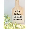 In This Kitchen We Dance | Chopping Board | Shelf Decor | Kitchen Decor | Personalised Chopping Board | New Home Gifts | Hallway Decor________________________________________________________________________________This beautiful pine chopping board is hand finished with a durable, resistant chalk paint and then a permanent vinyl design added. This would make a great gift!You can choose any colour you like from our selection.We can offer personalisation on this item, just send us a message!Chopping Board is 28x14cm and is for decor only.