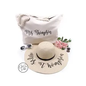 Personalised Beach Towel and Floppy Hat Set, Small Beach Essentials Bag, Honeymoon Gift, Personalized Beach Set, Personalize Beach Tote