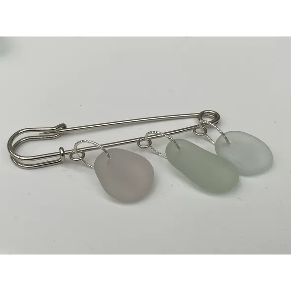 A sea glass kilt pin brooch inspired by a recent visit to the Scottish Borders. Sea glass colours of white, aqua and a rare hint of heather. Complimented with textured sterling silver jump rings. A nice addition to your jacket, coat, scarf and/or jumper.To protect the lifetime of your piece, please make sure your brooch is dried throughly, should it come into contact with water