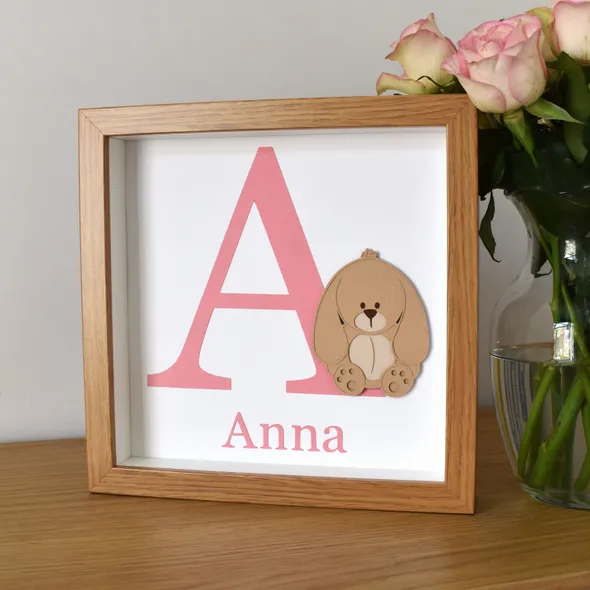 An ADORABLE bunny bear (because I can’t decide if it’s a cute bunny or a teddy bear ????).This frame will make the PERFECT gift for a newborn, a UNIQUE PERSONALISED KEEPSAKE for their nursery. The colour of the initial and name can be changed, I just used pink as an example.Can be sent DIRECT if requested. This will be wrapped in tissue paper, but an upgrade can be added for gift wrap, ribbon and a tag.Frame colour options are white, black and oak effect. There is no glass in the frame, it is a Perspex sheet for safety reasons.DUE TO BEING HANDMADE PLEASE ALLOW UP TO 2 WEEKS FOR DISPATCH.PERSONALISED ITEMS ARE NON-RETURNABLE/REFUNDABLE.I can do many other different designs and colours with any wording you wish. Please get in touch if you would like to know more or have a specific design request.Find my other items here.https://www.etsy.com/uk/shop/ElaraEnchantedFind me on Facebook, Instagram and Pinterest too.Thanks for lookingLove & Wishes from Elara Enchanted xx