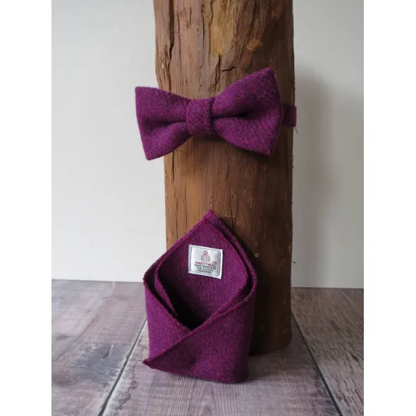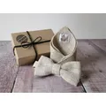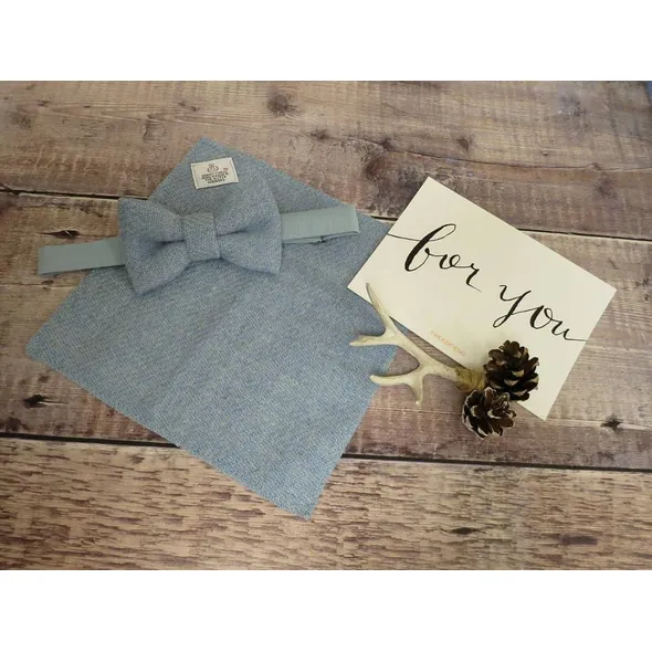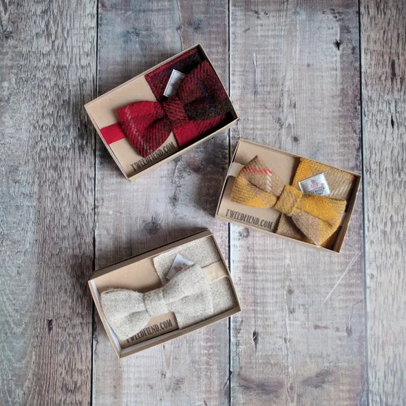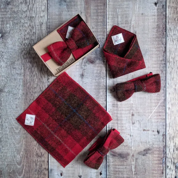 Give the gift of sartorial style. A beautiful gift set featuring a handmade wool Tweed bow tie and matching Tweed pocket square. Gift set will be made up in the Tweed of your choice. Where Harris Tweed is chosen the gift set will feature the orb authentication labels. The perfect present for the dapper gent in your life. Bow tie measures approximately 12cm by 6cm and fastens with a colour coordinated cotton strap that is fully adjustable. Pocket square measures approximately 19cm square and has neatly finished edges in matching thread. Presented in an embossed box tied with twine. Who doesn't love brown paper packages tied up with string? Add personalisation to give your gift that extra special touch - If you would like multiple gift sets to dress your groomsmen or for another special occasion, I'd love to be a part of your big day!