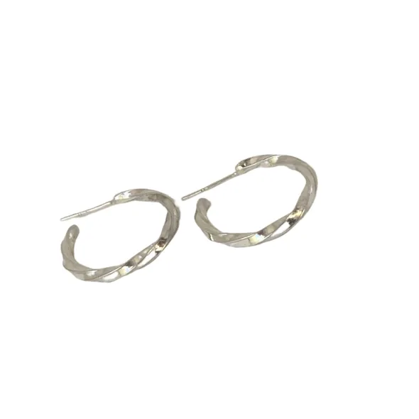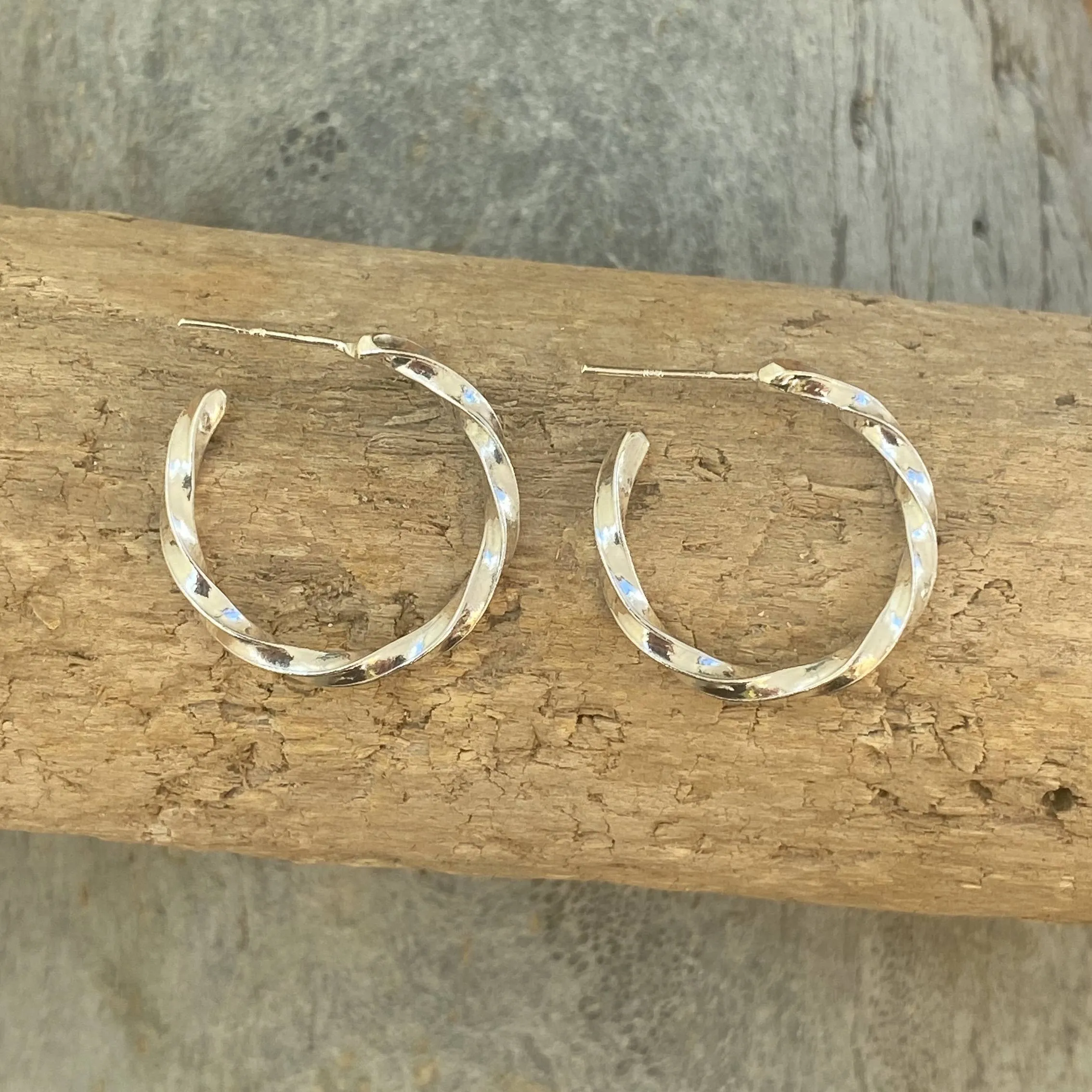 This striking pair of hand twisted hoops have been uniquely crafted using 100% Sterling Silver. The earring backs are sterling silver.