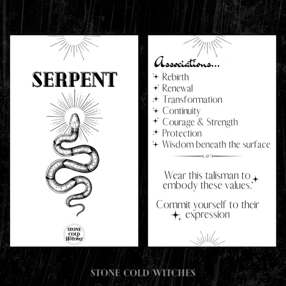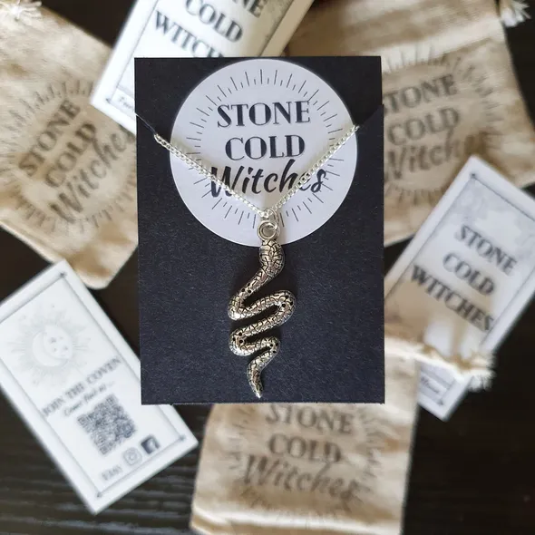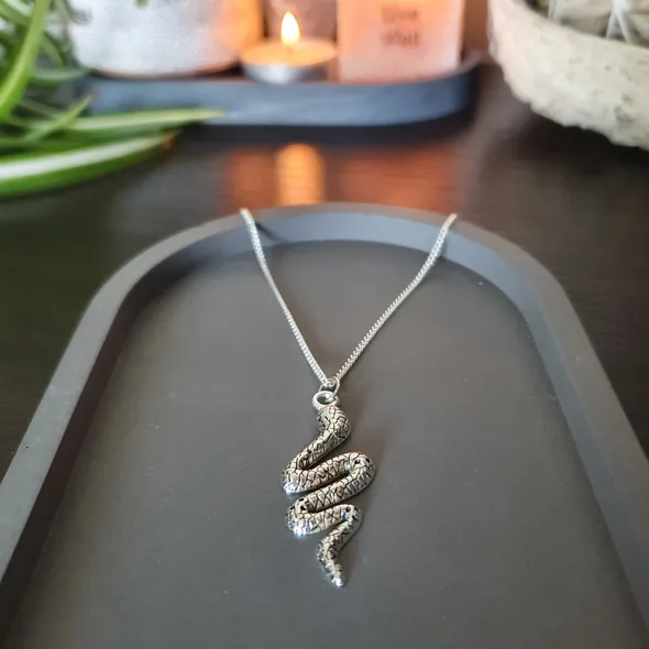 *~Hey Witches!~*Wear this serpent talisman and commit to expressing the attributes associated with the serpent, this creature has been long revered for its ties to the circle of life and transformation. The serpent is used for protection and has connections with several goddessesThe serpent is associated with... - Rebirth - Renewal - Transformation - Continuity - Courage & Strength - Protection - Wisdom beneath the surfaceThis piece is handmade using silver plated chain with a lobster clasp, the serpent pendant is silver in colour with dainty scale detailing to give a textured appearance. The necklace is approx 58cm but if you would like a bit of a variation on this length just drop me a message as all are handmade to order so adjustments can be made for you.If you have any questions, just drop a message!Lots of loveStone Cold Witches x