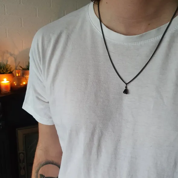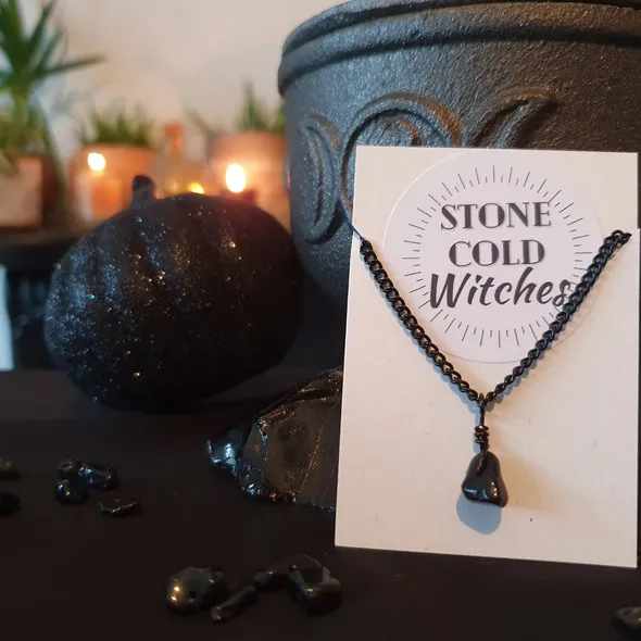 Inspired by Halloween this all black beauty will maximise your negative energy absorption needs.~The Crystal ~Obsidian is a powerhouse for negative energy cleansing, wear it around your neck to protect your energy from the negative influences of others. Obsidian creates a shield around you that unwanted energies cannot enter, allowing you to be true to yourself and your own beautiful vibes. Obsidian is also a powerful grounding crystal and aids in divination - helping you make decisions by gifting you with sight of whats to comeThis beauty is perfect for... * Energy Shielding* Decision Making* Protection* Grounding~The Necklace~This piece is handmade using black chain with black lobster clasp and black tarnish-resistant wire to bind the crystal into a pendant that hangs from the chain. The necklace is approx 60cm but if you would like a bit of a variation on this length just drop me a message as all are handmade to order so adjustments can be made for you ~Please do note ~ all items are handmade upon order and as such the crystals used can all differ in size, shape and slightly in colourIf you have any questions, just drop a message! Lots of loveStone Cold Witches x