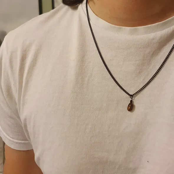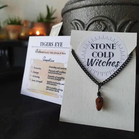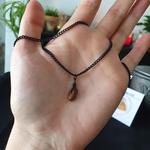 If you're looking to adopt a protection stone that doubles as a powerful grounding stone, you have come to the right place plus this all black beauty will maximise your negative energy absorption needs.~The Crystal ~Tigers Eye is a well-loved crystal that excels in providing you with grounding and centering but also activating energy. If you feel like you need to be brave, this stone can give you the courage and self confidence that you seek. It reminds you of your capabilities and strengths, inspires motivation, determination and perseverance and also promotes mental clarity and aids in problem solving.This beauty is perfect for... * Protection* Courage* Activating* Inner Strength~The Necklace~This piece is handmade using black chain with black lobster clasp and black tarnish-resistant wire to bind the crystal into a pendant that hangs from the chain. The necklace is approx 60cm but if you would like a bit of a variation on this length just drop me a message as all are handmade to order so adjustments can be made for you ~Please do note ~ all items are handmade upon order and as such the crystals used can all differ in size, shape and slightly in colourIf you have any questions, just drop a message! Lots of loveStone Cold Witches x