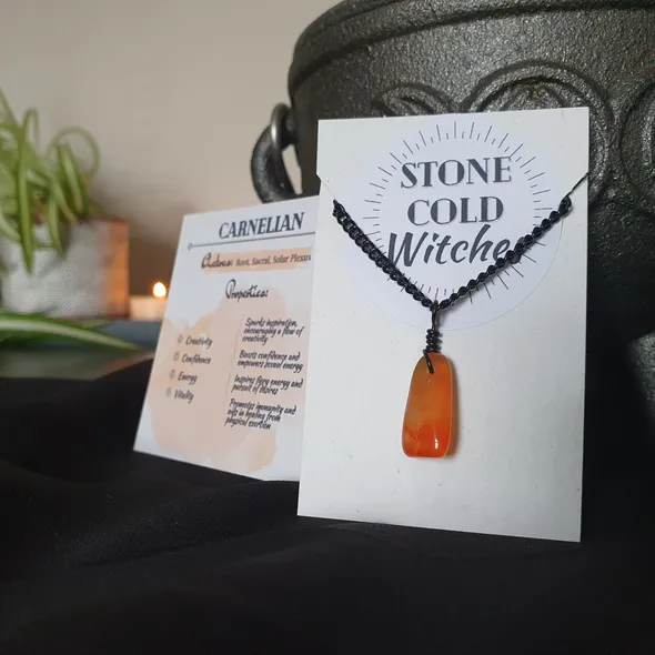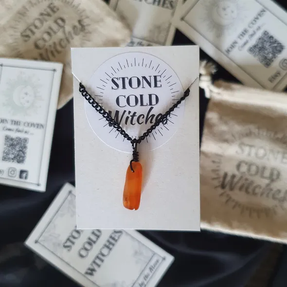 *~Hey Witches!~* Who couldn’t benefit from wearable crystal healing? Ready to light a fire in yourself and open the floodgates to creative inspiration? ~The Crystal ~Carnelian is here to get your blood pumping! This crystal will fill you with fiery energy to fuel your creativity, filling you with the confidence to see things through and hold your ground. Carnelian boosts your immune system, aids in recovery from major physical exertions, and empowers sexual energy.This beauty is perfect for...*Creativity*Confidence*Energy*Vitality~The Necklace~This piece is handmade using black chain with black lobster clasp and black tarnish-resistant wire to bind the crystal into a pendant that hangs from the chain. The necklace is approx 57cm but if you would like a bit of a variation on this length just drop me a message as all are handmade to order so adjustments can be made for you ~Please do note ~ all items are handmade upon order and as such the crystals used can all differ in size, shape and slightly in colourIf you have any questions, just drop a message!Lots of loveStone Cold Witches x