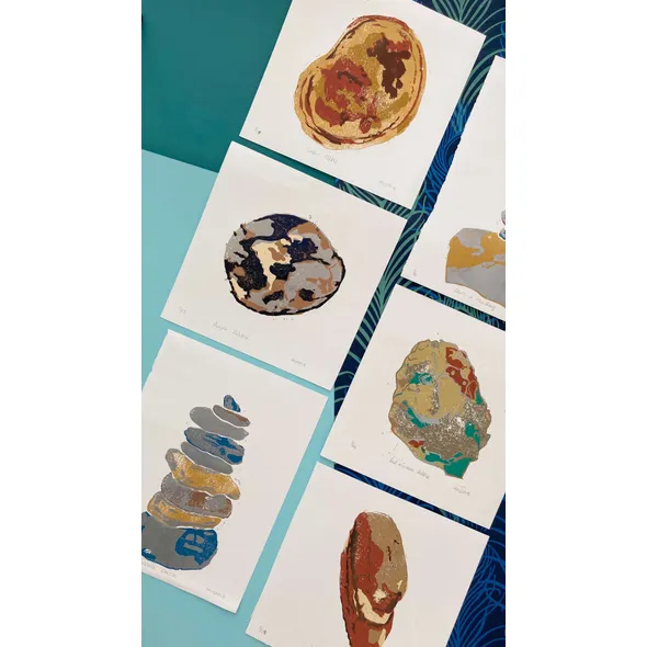 During lockdown, I realised how utterly vital it was for me to be by the sea because there was a long stretch of time when I couldn’t go there and my depression took a massive hit. This was when I realised that I wanted to make artwork that reflected my need for and relationship with the seaside.I scrawled down notes about everything that I loved about the sea. Some of the words that cropped up were: freedom, calm, content, pebbles, treasures and shells. I came up with so much that it was a little overwhelming (ironic) so I went for a walk along the beach with my camera and found myself collecting pebbles. I found different colours and textures and enjoyed the tactile nature of holding and stroking them. ‘This,’ I thought,’ is where I need to start!’And so began the Seaside Treasures Collection - an exploration of the intricacies of pebbles found on my calming walks. It’s a close up of the surfaces and colours that each tiny treasure possesses. It’s amazing to wonder where they started life and what they’ve been through - each completely different because of their journey - much like people are.This piece is 28cm x 30cm and in an edition of 10.Oil based Cranfield inks on Fabriano Unica paper.Can I spread the cost?Yes you can! You can choose to use PayPal when you purchase and they will give you the option to pay in full or in 3 payments.Satisfaction GuaranteeI know you’ll love this print as much as I do. In fact, if for any reason you’re not completely satisfied, just return your print within 30 days and we’ll issue a full refund. Find out more here.