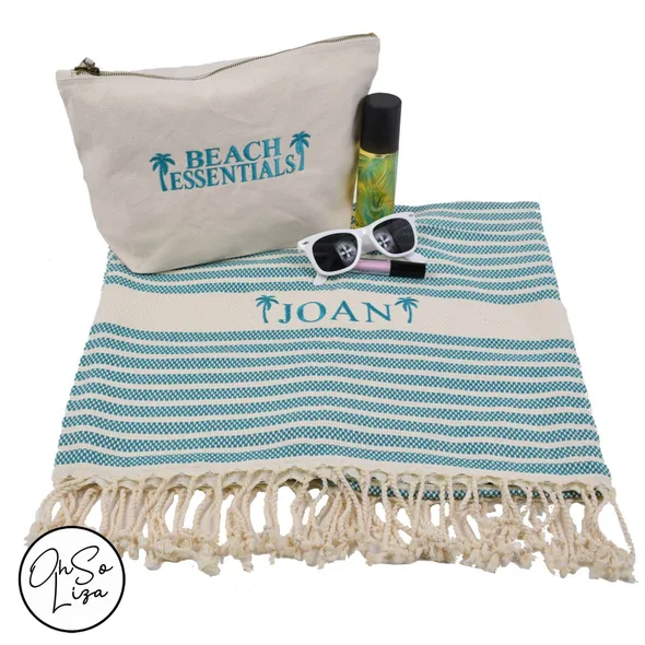 Welcome to Oh So Liza and thank you for visiting my shop. Have you been looking for the perfect gift with style to show off this summer, this boardwalk beach bag delivers as a key statement piece for fans of the popular maxi-bag style. Then add in the Turkish Beach Towel with a Beach Essentials Mini Bag it shouts Chic all the way to the beach. The bag offers a chunky rope carry handle offering a classic nautical styling while premium brushed canvas makes this a robust choice for a day at the beach. With an inside zipper pocket to keep your small items safe on the sand. The towel can be folded to a very compact package and the essentials bag keeps all those littler items in one place. The perfect go to Beach Set for any occasion. ???? ABOUT YOUR TOWEL AND ESSENTIALS BAG SET???? **********TURKISH BEACH TOWEL************* These beautiful towels are handwoven in an authentic way according to traditional patterns. This makes this towel very special and so very beautiful. The towels are made of 100% cotton, weigh only 430 gram and can be folded to a very compact package. Therefore, they are ideal for transport in your suitcase, backpack or beach bag. Take them on trips to the beach, to your boat, to the swimming pool, to the sauna or to the gym. Hamamzz® are traditionally woven in Turkey. The tassels are twisted and knotted by women by hand. Size One size (100 x 180cm) OR (40inches x 71 inches) ***ABOUT YOUR PLAIN ESSENTIAL BAG** Cotton Canvas Bag in PLAIN Black, Navy, Pink, Gray, Off White and Natural With A Durable Metal Vintage style metal. Dimensions L - 13 x 9 x 4.3 Inches, Perfect for your all your Creams ect ???? HOW TO ORDER???? 1. Select the Colour Towel you Would Like (from the drop down menu) 2. Select the Colour Essentials Bag you would like (from the drop down menu) Include in the Personalisation box the Thread Colour you would like adding to the Bag and Towel with Name/Text you would like embroidered on the Beach Towel NB (The thread colour will always be used to match the towel unless otherwise stated) Example We need 1 set Natural Essentials Bag Hot Pink Text ( Beach Essentials) to match towel Towel Pink Text Liza in Pink to match towel *THIS LISTING IS FOR THE PERSONALISED BAG, TOWEL ONLY, PROPS NOT INCLUDED* **If you would like a custom listing for a larger quantity of bags then please let me know and I will sort this out for you asap. Colours may appear different due to monitors/screens. Thank you for shopping with me. Oh Liza © All designs and images belong to OhSoLiza and are subject to Copyright - do not replicate in any way.